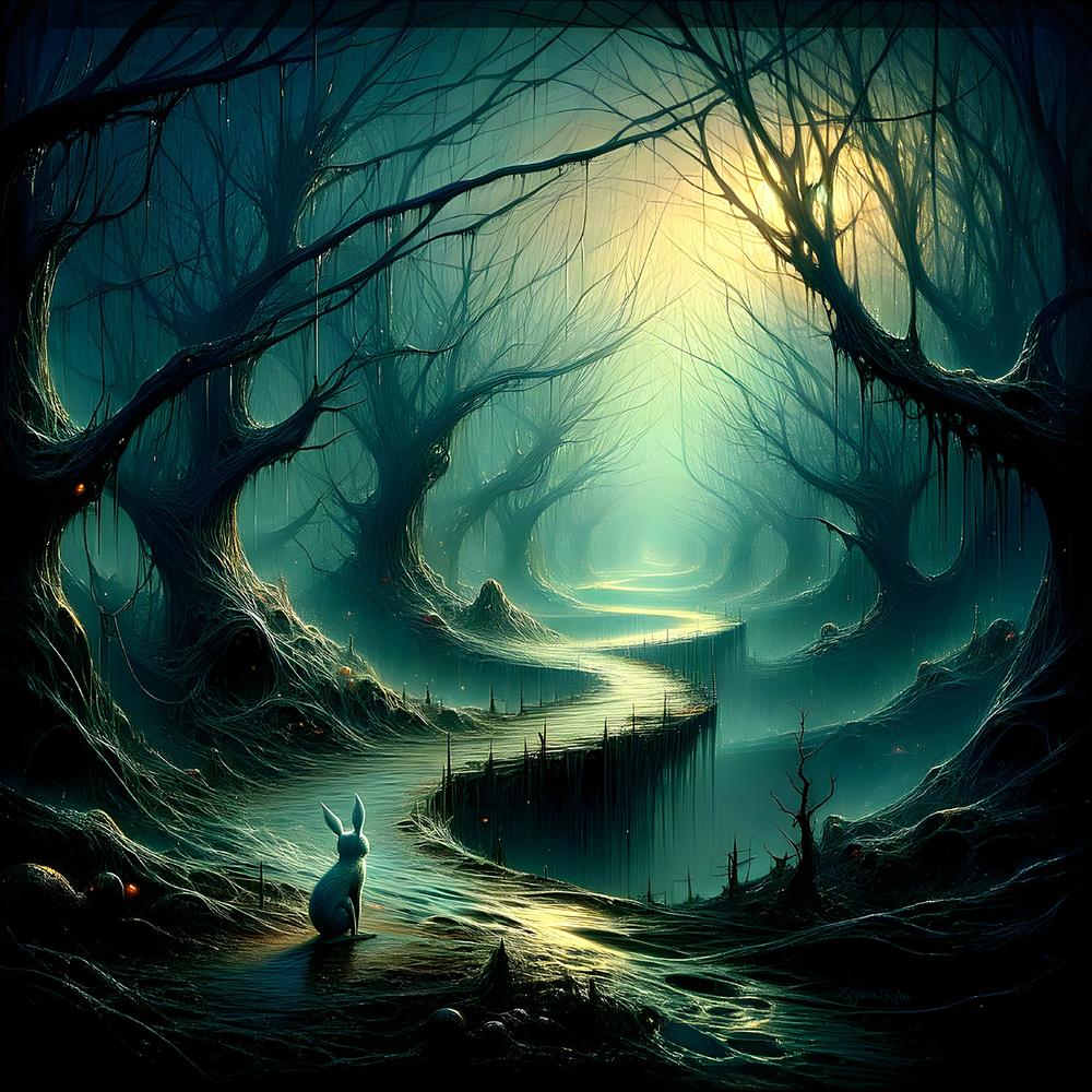 A mesmerizing landscape painting captures the essence of falling into a mysterious rabbit hole. Dark shadows, eerie creatures, and a sense of existential dread are depicted in a surreal masterpiece with dramatic lighting and an intense atmosphere. Based on a poem I wrote 20 years ago.