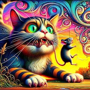 An ultra-detailed painting of a cheshire cat and a petrified mouse with vibrant colors and whimsical details.