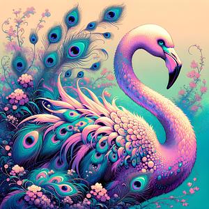 A stunning artwork featuring a flamingo with peacock feathers in vibrant pinks, purples, blues, and greens. The piece is highly detailed, elegant, and intricate, with dynamic lighting and a cute appeal.